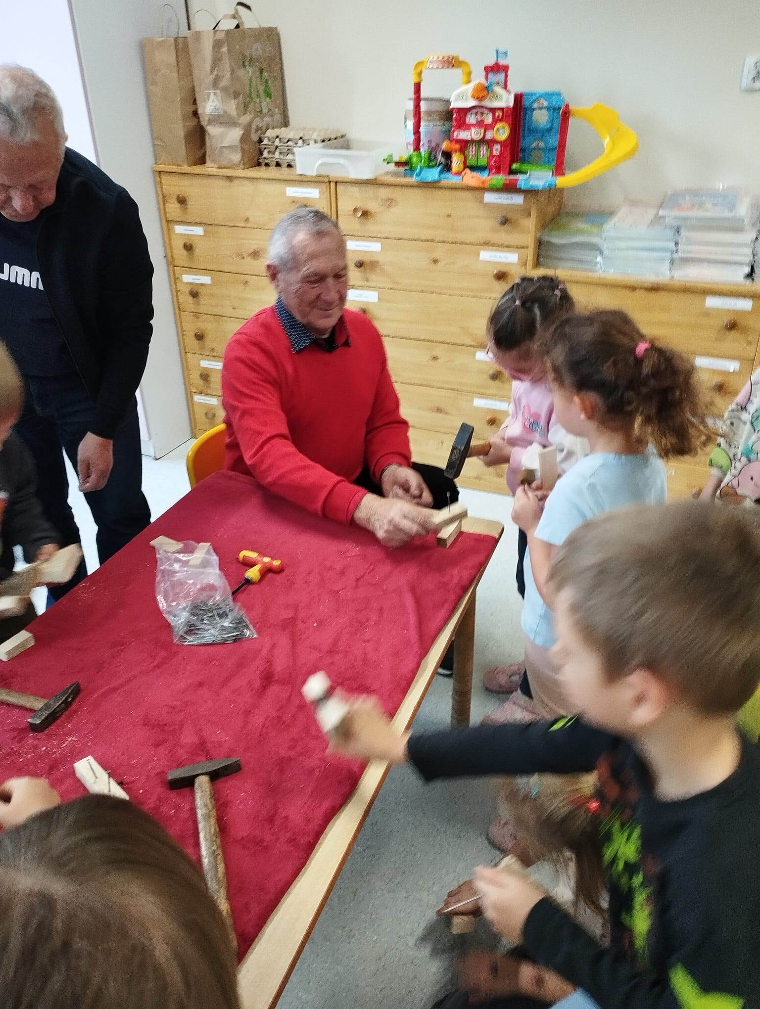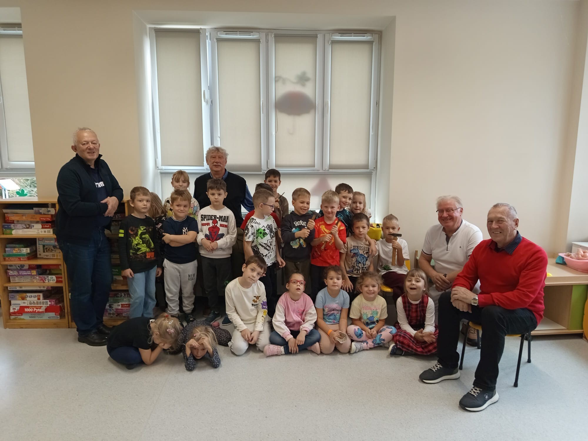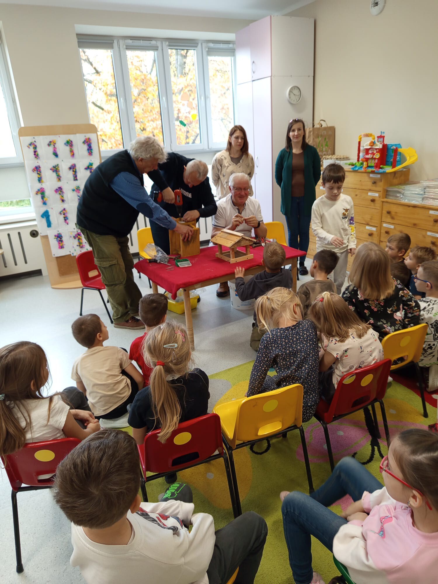 Przedszkolaki z Przedszkola nr 9 zdobywają wiedzę potrzebną do budowy karmników. Oczywiście pod okiem super budowniczych